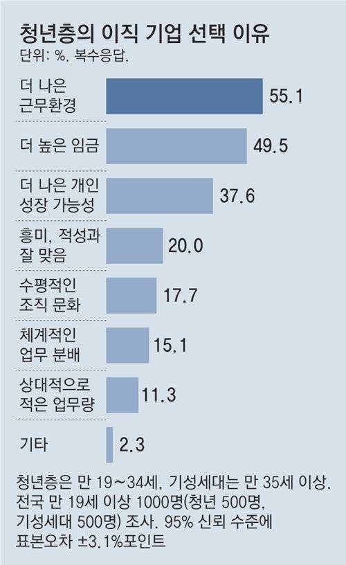 청년들은 새 직장을 선택할 때 가장 먼저 고려하는 요소로 ‘근무 환경’(55%)을 꼽았다. ‘더 높은 임금’(50%)이나 ‘개인의 성장 가능성’(38%)이 뒤를 이었다.