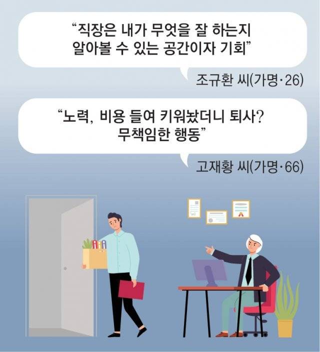 반면 기성세대 중에는 여전히 퇴직을 부정적으로 보는 경우가 적지 않았다. 중소 건설업체 대표 김현수(가명·58) 씨는 “직원을 채용하고 직장에 적응하도록 돕는 과정에 기업의 노력과 비용이 든다”며 “일단 한곳에 몸 담기로 했다면 최소 수년 동안은 애사심을 갖고 최선을 다하는 모습을 보여야 한다”고 말했다. 외국계 중견기업 대표를 지낸 고재황(가명·66) 씨도 “불가피한 경우는 어쩔 수 없지만 경영진 입장에서 퇴직은 ‘다 키워 놨더니 나간다’는 느낌이 든다. 잦은 이·퇴직은 무책임한 행동으로 보일 수 있다”고 지적했다.