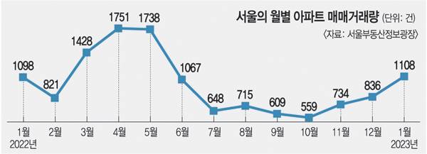 12일 서울시에서 운영하는 부동산 정보 플랫폼 서울부동산정보광장에 공개된 현황을 보면 올해 1월 서울 전체 아파트 매매거래는 1108건으로 집계됐다. 이 거래량이 네 자릿수로 올라서기는 지난해 6월(1067건) 이후 7개월 만이다. 지난해 1월 1098건보다도 많다. 지난해 4월 1751건이었던 서울 아파트 매매거래는 매월 줄어 같은 해 7월에 648건으로 1000건 선이 무너졌다. 이후 반 년간 세 자릿수를 벗어나지 못했다. 지난해 2월 821건으로 내려앉았다 한 달 만에 1428건으로 올라선 때와 달리 위축된 심리가 오래 지속했다. 그러다 10월 559건을 바닥으로 3개월 연속 늘었다.