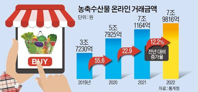 통계청에 따르면 농축수산물 온라인 거래액은 2021년 7조1164억원에서 2022년 7조9816억원(잠정)으로 12.2% 늘었다. 그러나 성장률은 하향세를 보였다. 2019년 3조7230억원에서 2020년 5조7925억원으로 55.6% 급증한 이후 2021년 전년 대비 성장률은 22.9%, 2022년에는 12.2%로 그 기세가 한풀 꺾인 모습이다.