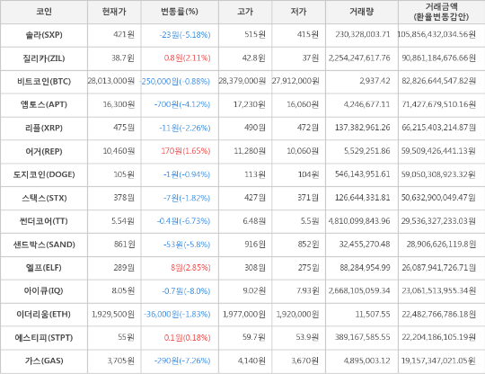 가상화폐 시세 (제공: 암호화폐 거래소 업비트)현재 암호화폐 거래소 "업비트"에 따르면 가상화폐 대장 격인 비트코인의 시세는 전일 대비 -250,000원(-0.88%) 하락한 28,013,000원에 거래되고 있다.