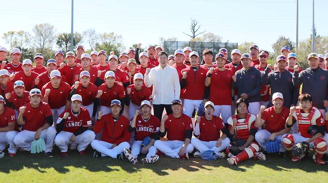정 구단주는 이어 "야구장 면이 많고, 우리 팀만이 시설을 독점적으로 이용할 수 있다. 무엇보다 숙소와 훈련장이 같은 장소에 있어 이동에서 시간을 허비하거나 컨디션을 낭비하는 일이 없기 때문에 아주 만족한다. 그제 선수단과 저녁을 먹으며 이야기를 들어보니 만족도가 아주 높은 것 같아 좋았다"고 캠프지에 대한 만족감을 전했다.