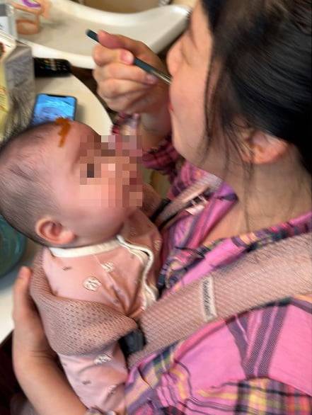 공개된 사진 속에는 김영희가 딸을 품에 안고 식사를 하는 모습. 그는 자신을 바라보는 딸의 이마에 반찬을 올려놓기도 했다. 특히 자신이 사용하던 젓가락으로 이마를 누르는 등 다소 위험하고도 비위생적인 상황을 연출했다.