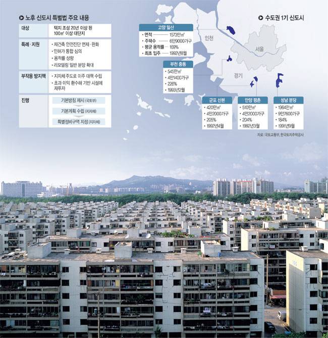 정식 명칭은 ‘노후계획도시 정비 및 지원에 관한 특별법’이다. 국토교통부는 ‘1기 신도시 정비 민관합동 태스크포스(TF)’ 제7차 전체회의를 열고, 경기도 내 1기 신도시(성남 분당·군포 산본·고양 일산·부천 중동·안양 평촌) 등 노후계획도시의 광역적 정비를 질서 있고 체계적으로 추진하기 위해 1기 신도시 특별법의 주요 내용을 확정 발표했다. 1기 신도시는 1989년 4월 건설계획 발표 이후 1991년부터 입주가 시작됐다. 현재 1기 신도시 거주 인구만 117만여 명이 넘는 수준이다. 준공 30년을 넘기며 아파트뿐만 아니라 교통 등 인프라도 노후화해 주민들의 재건축 요구가 이어졌다.