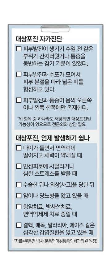 문 원장은 자가진단법으로 "큰 수술을 받았거나 당뇨, 암 등 면역이 떨어진 사람, 여행, 스트레스나 과도한 업무로 지치고 피로한 사람에게서 피부 발진 3~7일 전부터 통증을 동반한 가벼운 감기 증상(가려움·저림·피로·가려움·미열 등)이 있으며 그 후 붉은 반점이 몸통과 얼굴 등 신체의 한쪽에만 띠 모양으로 나타나고 띠를 따라 화끈거리고 쑤시는 통증이 생기면 대상포진을 의심하여 빨리 전문의 진단을 받아야 한다"고 조언했다.