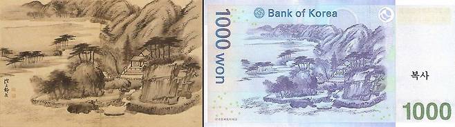 | ▲ 계산정거도와 1000원권 지폐 왼쪽이 겸재 정선의 계산정거도, 오른쪽이 천원권 지폐 |