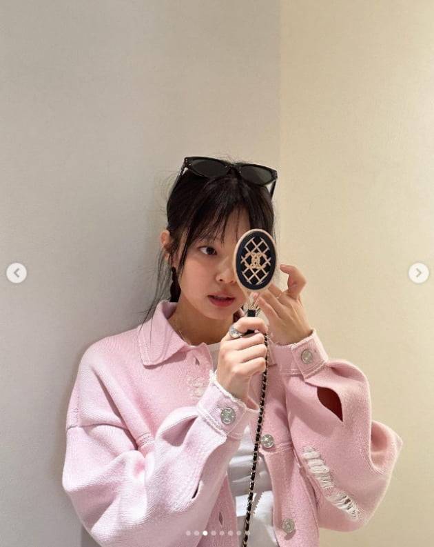 사진 속 제니는 화사한 핑크 자켓으로 꾸미고 손거울을 보며 화장을 고치고 있다.