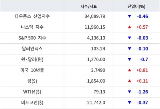 이날 국채금리는 상승했다. 연준 통화정책에 민감한 미국 2년물 국채금리는 전일대비 약 2% 올라 4.63% 선에서 움직였다. 미국 10년물 국채금리는 3.79%선까지 올랐다.