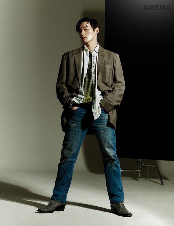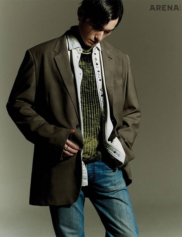 회색 울 소재 재킷 가격미정 메종 마르지엘라, 데님 셔츠 가격미정 골든구스, 데님 팬츠 가격미정 리바이스, 니트·회색 부츠 모두 가격미정 디젤, 반지 가격미정 돌체앤가바나 제품.