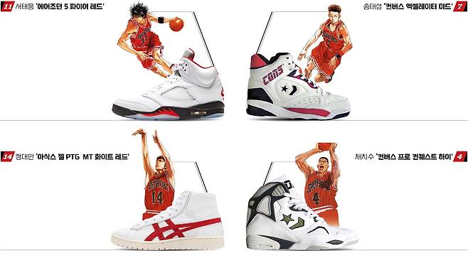 북산의 골 밑을 지키는 채치수가 신은 것은 ‘컨버스 프로 컨퀘스트 하이’다. 나이키 에어조던이 등장하기 전까지 NBA의 최정상 선수들은 컨버스 농구화를 애용했다. 흰색과 검은색으로만 이뤄진 심플한 디자인에 컨버스 로고가 특징이다. 프로 컨퀘스트 하이는 뉴욕 닉스의 포워드 버나드 킹의 시그니처 농구화다. 채치수와 외모도 비슷해 작가가 참고해 캐릭터를 창작한 것으로 알려졌다.