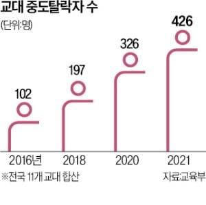 2016년 102명이었던 교대 중도탈락자(자퇴 미등록 유급 등)는 2021년 426명으로 5년 만에 네 배 넘게 증가해 사상 최대를 기록했다. 전국 교대 중 입학 성적이 가장 높은 서울교대마저 같은 기간 중도 탈락자가 11명에서 53명으로 다섯 배가량 늘었다. 입학 점수도 급락해 올해는 대학수학능력시험 9등급을 받은 학생이 경인교대 정시 1차에 합격한 사례까지 나왔다.