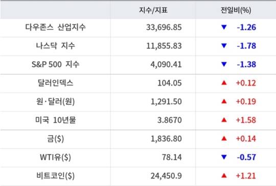 이날 국채금리는 상승했다. 미국 10년물 국채금리는 전날보다 6bp가량 오른 3.86% 근방에서 거래됐다. 이는 올해 1월 초 이후 최고치다. 2년물 국채금리는 전날 4.7%까지 올라 지난해 11월 이후 최고치를 경신했으며 이날도 4.65% 근방에서 거래됐다.