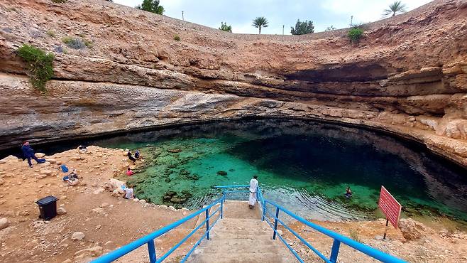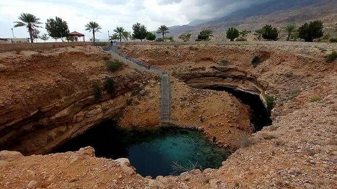 무스카트에서 자동차로 약 1시간 30분을 달리면 '비마 싱크홀 공원'에 닿는다. 각각 50m, 70m 크기의 구멍이 약 20m 깊이 땅속으로 꺼진, 이름 그대로 싱크홀인 이곳은 그 안을 채우고 있는 신비로운 청록색 물빛이 매우 인상적인 곳이다.
