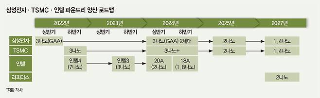 산업연구원은 “미국은 반도체 기업에 500억달러(약 62조원) 이상 보조금 혜택이 포함된 반도체법을 시행하고 일본도 핵심 소재와 제조 장비 분야에서는 강점을 보유하고 있다”며 “미국의 역량이 올라오는 2025년에는 대만-한국-미국, 2027년에는 일본을 포함해 파운드리 4강 구도로 재편될 것”이라고 예측한다.