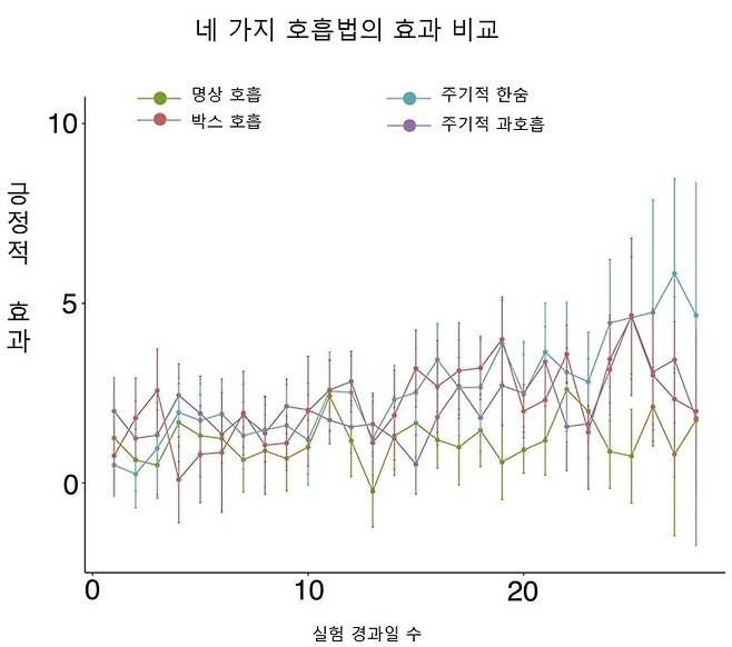 주기적 한숨 호흡은 네 가지 호흡법 중 특히 호흡수가 가장 많이 감소했으며 에너지, 기쁨, 평화와 같은 긍정적 정서가 가장 많이 개선됐다.