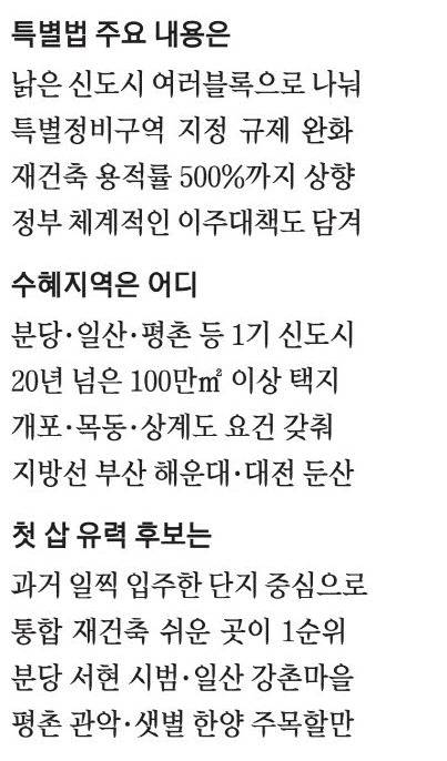 특별법 적용 대상은 100만㎡ 이상 규모의 택지지구 가운데 조성된 지 20년이 넘은 곳이다. 일반적으로 신도시는 면적이 300만㎡(약 100만평) 이상이다. 100만㎡는 이보다 작은 '미니 신도시'급으로, 인구 2만명 안팎을 수용한다. 대규모 신도시 말고도 재정비가 필요하다면 특별법 혜택을 적용받아 사업을 진행할 수 있다는 뜻이다.