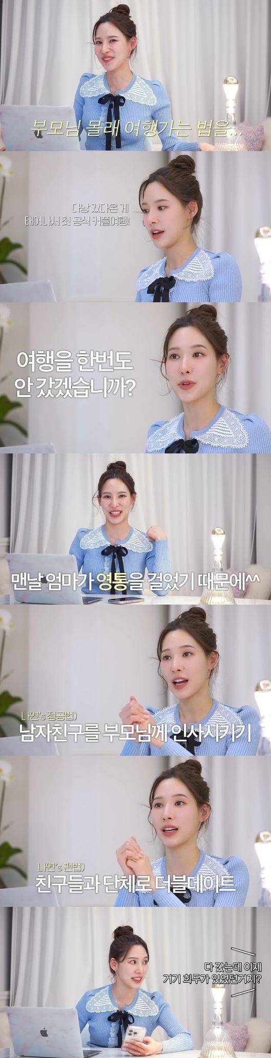 이를 들은 어머니는 "갔어..?"라며 충격을 받았고, 이나연은 "갔다. 제가 한번도 안갔겠냐. 가긴 갔다"고 털어놨다. 그는 "사람 사는게 다 똑같죠. 엄마가 너무 째려본다"며 "근데 사실 단둘이 가는건 어려웠다. 저는 난이도가 극악이었다. 엄마가 맨날 영통을 걸어서 보통 친구들이랑 같이 갔다. 친구들의 커플 아니면 다같이 가거나 학교에 일이 있거나 엠티를 간다거나 이런 식으로. 엠티가 하룬데 이틀 간다고 하거나 이런식으로 거짓말 했다"고 설명했다.