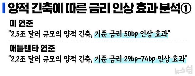 지난해 6월 미 연준은 2.5조 달러 규모의 양적 긴축은 기준 금리를 0.5% 인상하는 것과 같은 효과를 낼 것이라고 연구 결과를 내놨습니다. 한 달 뒤 미 애틀랜타 연준은 조금 더 세분화한 연구 결과를 내놨습니다. 평상시 2.2조 달러 규모의 양적 긴축은 기준 금리를 0.29% 인상하는 것과 같지만, 불확실성이 극대화한 시기에는 기준 금리를 0.74% 인상하는 것과 같은 효과가 나타날 것이라 추정했습니다.