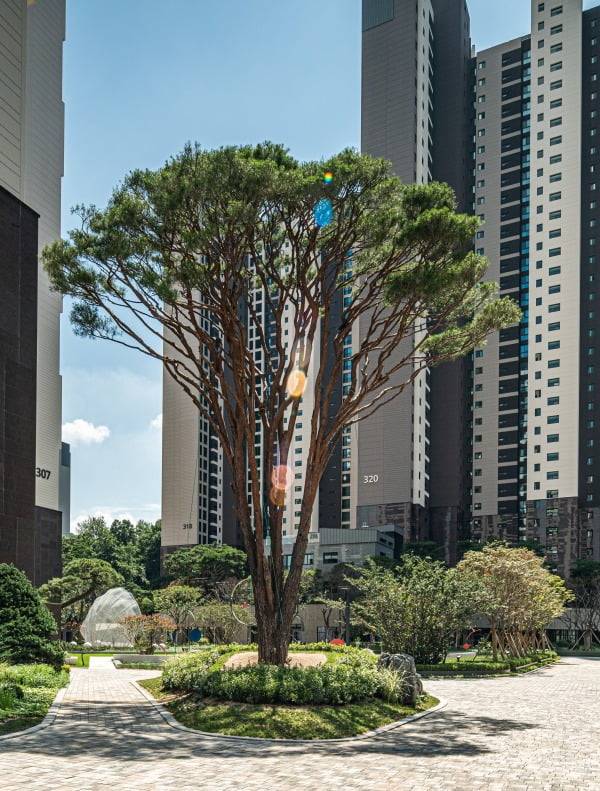 조경수로 쓰이는 소나무의 모양도 다양하다. 현대건설은 2019년 입주한 개포동 디에이치아너힐즈(개포주공3단지)에는 브로콜리 모양의 반송 소나무(사진)를 공수해 심기도 했다. 현대건설 관계자는 "일반적인 반송보다 훨씬 높은 키의 특별한 나무"라고 설명했다. 중앙광장에는 시가 수억 원의 서산 소나무와 부여산 금송을 식재했다.
