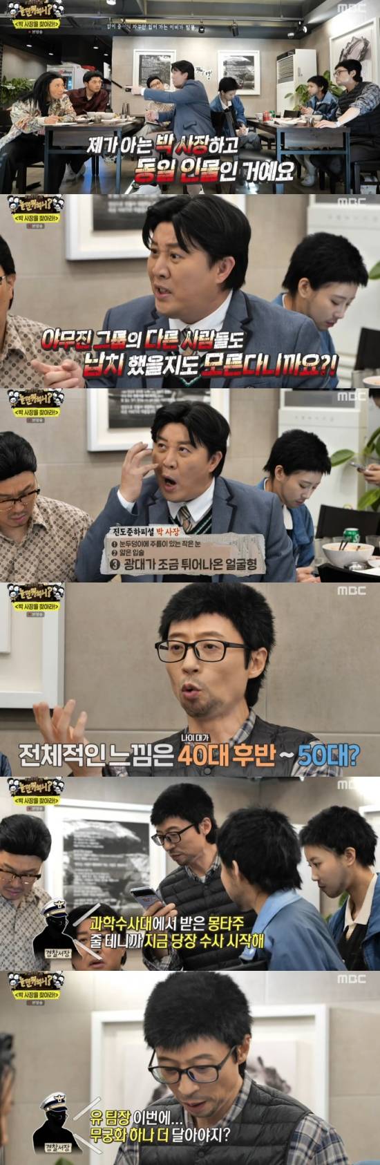 박진주는 "박 사장은 어떻게 생겼냐"라며 물었고, 정준하는 "사장님 심복으로 일을 해서 얼굴이 알려져 있지 않다. 눈두덩에 주름이 있는 작은 눈. 그리고 입술이 되게 얇다. 입술이 얇은 입술이고. 얼굴형은 광대가 좀 나왔다. 그리고 이마가 좀 넓다. 이마가 좀 넓었고 주름이 좀 있다"라며 귀띔했다.