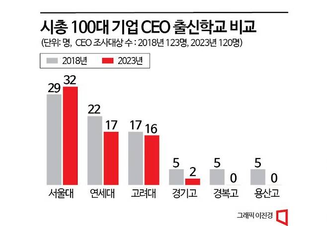 5년 전에 비해 CEO들의 일명 스카이 대학교 쏠림 현상은 다소 완화됐다. 올해 CEO 대상으로 집계한 스카이 출신은 65명으로, 매년 100대 기업의 CEO 프로필 조사 결과를 공개하는 월간 현대경영이 2018년 발표한 68명에 비해 3명 줄었다. 5년 전에는 3명이었던 부산대 출신이 올해는 6명으로 2배 증가했고, 4명이었던 인하대 출신이 5명으로 늘었다.