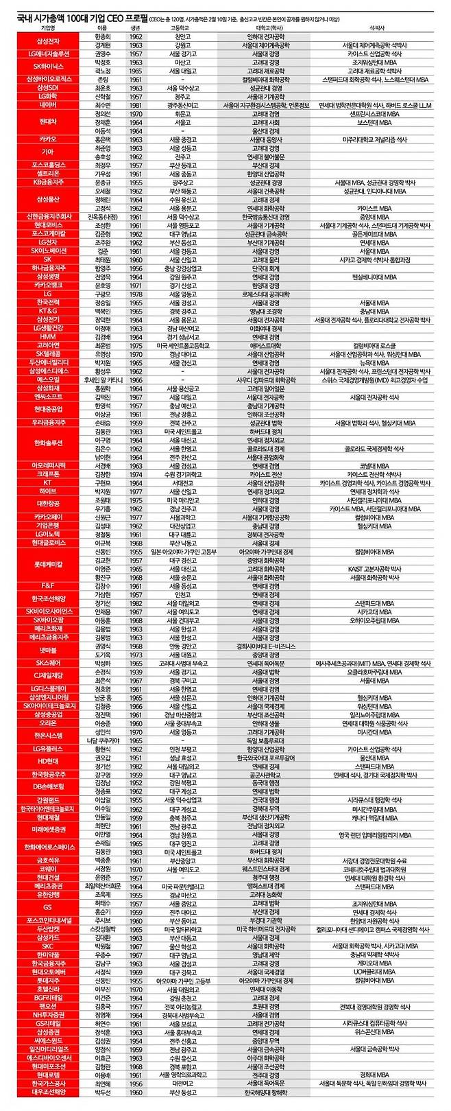 [아시아경제 김보경 기자] 우리나라 기업에서 임원은 '별'로 불린다. 그만큼 되기 어렵다는 의미를 담고 있다. 별 중의 별은 최고경영자(CEO)다. 주요 기업의 인사가 집중된 연말연시에는 이 별들이 뜨고 진다. 이 시기가 지나면 새로운 한 해 우리 기업을 이끌 면면이 드러난다. 단지 우리 회사에 국한된 문제가 아니다. 한국 100대 기업의 CEO는 우리나라 경제 국가대표다. 이들이 어떤 사람인지를 들여다보는 것은 우리나라 산업이 어떻게 움직이고 있는지 파악하는 단초가 된다는 의미다. 아시아경제는 시가총액을 기준으로 한국 100대 기업을 뽑고 이 기업의 CEO를 살펴봤다. 총 120명의 나이와 출신 지역, 학교 등을 분석했다.