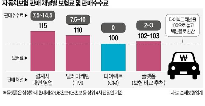 단일안의 핵심은 플랫폼 요율의 신설이다. 현재 보험사들은 보험설계사 대면 영업이나 텔레마케팅, 다이렉트 등 판매 채널에 따라 다른 요율을 적용하고 있다. 채널마다 지급 수수료나 인프라 투자 및 운영 비용 등에서 차이가 나기 때문이다. 보험사 자체 홈페이지 또는 모바일 앱을 통해 고객이 스스로 보험 상품을 설계하고 가입하는 다이렉트 채널이 가장 저렴하다. 다이렉트 채널의 보험료를 100이라고 하면 텔레마케팅 110, 설계사 대면 영업 115 등 수준에서 가격이 책정돼 있다. 여기에 추가되는 플랫폼 요율은 102~103 정도로 다이렉트 채널과 거의 비슷하게 결정될 예정이다.