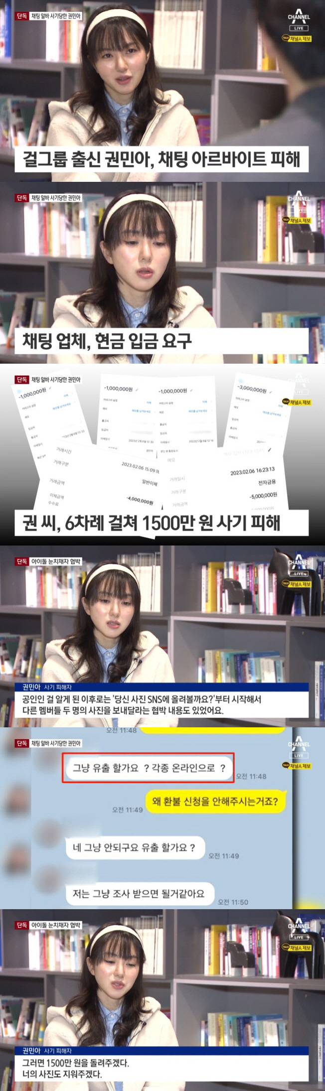 그룹 AOA 출신 권민아가 채팅 아르바이트를 했다가 1500만 원 상당의 사기 피해를 당했다.