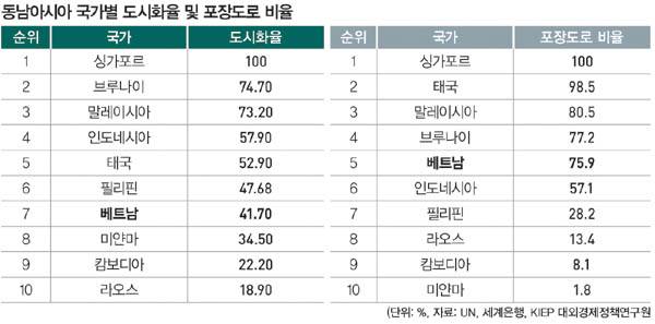 베트남 2030년까지 도시화율 50% 달성 목표 2000년 24.4%, 2011년 31.1%였던 베트남 도시화율이 2022년 41.7%로 처음 40%대에 진입했다. 베트남은 아세안 10개국 중 도시화율 7위로 빠르게 발전하는 국가 경제 규모에 비해 아직도 도시화율이 저조하다. ‘급속한 도시화가 경제적 효율성과 빠른 경제 성장을 가져온다’는 폴 로머 교수의 이론에 따르듯 베트남은 도시화율에 더욱 박차를 가하고 있다. 베트남 정부는 2025년까지 도시화율 45%, 2030년까지 50% 달성을 목표로 내걸었다.