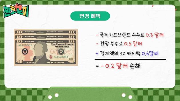 그런데 혜택이 변경되면 캐시백으로 들어오는 돈은 0.9달러에서 0.6달러로 크게 줄어듭니다. 당연히 수수료로 내는 돈(0.8달러)이 캐시백되는 금액(0.6달러)보다 커졌습니다.