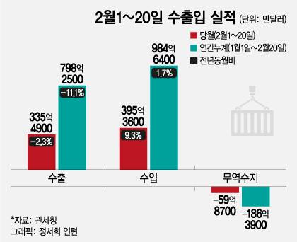 반면 수입은 같은 기간 꾸준히 늘었다. 지난해부터 올해 1월까지 수입이 마이너스를 기록한 것은 지난해 12월(-2.5%), 올해 1월(-2.6%) 등 두 달뿐이다. 2월 1~20일에는 수입이 9.3% 늘어 이달 증가 전환이 예상된다.