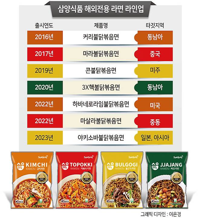 해당 제품은 모두 해외에서만 판매되지만 국내 소비자들의 요청 쇄도에 국내 판매까지 이어진 제품도 있다. 2016년 출시된 ‘커리불닭볶음면’이 대표적이다. 커리불닭볶음면은 동남아 시장을 타깃으로 나왔던, 불닭의 매운맛에 향신료 커리를 더한 제품이다.