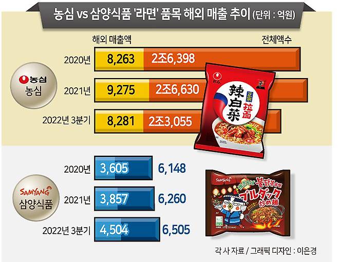 삼양식품의 경우 국내보다 해외에서 팔리는 라면의 비중이 더 높은 상황이다. 2020년 3605억원(라면 전체 6148억원·비중 58.6%)이었던 라면 품목 매출액은 지난해 3분기 기준 4504억원(6505억원·69.2%)을 넘어섰다. 농심의 경우 전체 라면 매출 중 해외 매출의 비중이 2020년 31.3%(8263억원)에서 2021년 34.8%(9275억원), 지난해 3분기(누적) 35.9%(8281억원)로 높아진 상태다.