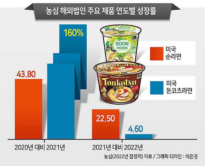 21일 업계에 따르면 현지 입맛을 공략한 해외 전용 제품이 ‘선방’하며 해당 업체의 실적 상승을 이끄는 모양새다. 농심의 경우 미국 시장을 겨냥해 판매하고 있는 채식주의자용 ‘순라면’의 2021년과 2022년 매출액은 전년 대비 각각 43.8%, 22.5% 성장했다. 또 다른 제품인 일본식 ‘돈코츠라면’도 2021년과 2022년 매출액이 각각 160%, 4.6% 상승했다.