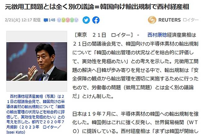 자민당 출신의 7선 중의원 의원인 니시무라 대신의 발언에 관해 이날 일본어판 <로이터통신>은 '전 징용공 문제와는 다른 논의 - 한국에 대한 수출규제 관련 니시무라 경산상'이라는 도쿄발 기사에서 아래와 같이 보도했다. 괄호 속 내용은 원문 그대로다.