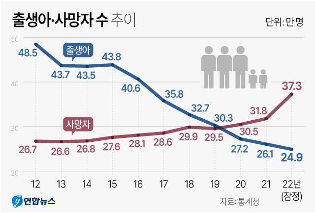 통계청이 22일 발표한 '2022년 출생·사망통계(잠정)'를 보면 작년 한국 인구는 12만3800명이 자연 감소(사망자 수-출생아 수)했다.