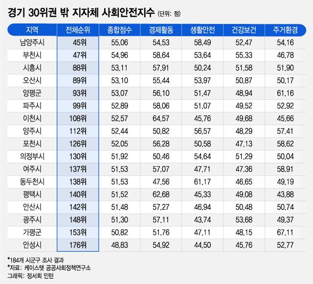 건강보건 차원이 주로 우수했던 서울 상위권 지역과는 달리 경기도 상위권 지역은 생활안전 차원에서 전반적으로 좋은 결과를 보여줬다. 지역 5위이자 전국 10위인 안양시(58.72점)는 생활안전 차원이 64.06점으로 7위였고, 11위인 군포시(58.72점)는 생활안전 차원이 5위(65.13점)였다. 위례신도시, 미사강변도시 등으로 인구 유입이 대거 늘어난 하남시(59.07점·8위)는 경제활동 차원이 8위(63.04점)로 순위 상승을 이끌었다.