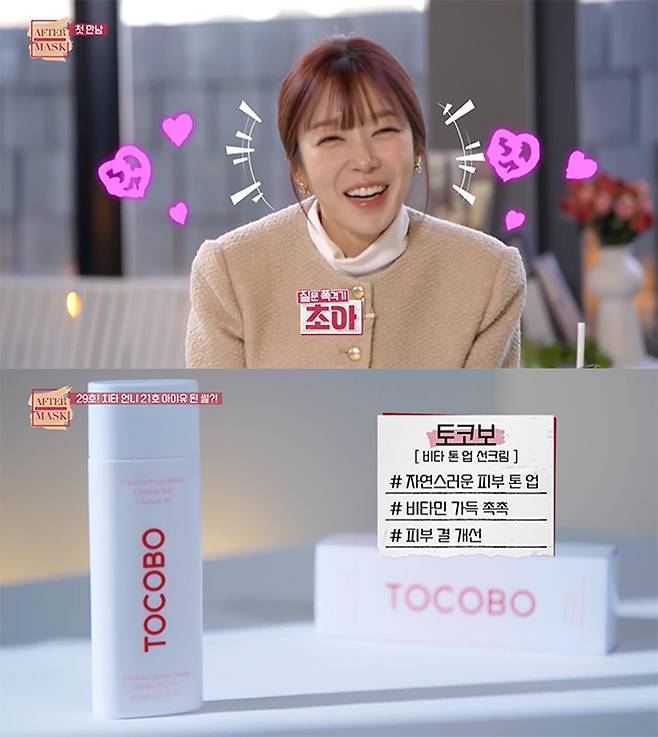 1회 사연자의 피부톤 고민에 대한 해결로 꼽힌 토코보의 '비타 톤업 선크림'은 자연스러운 핑크빛 톤업 효과를 선사하는 톤업 선크림으로, 밀크 로션을 바른 듯한 촉촉한 로션 제형의 끈적임 없는 사용감이 특징이다.