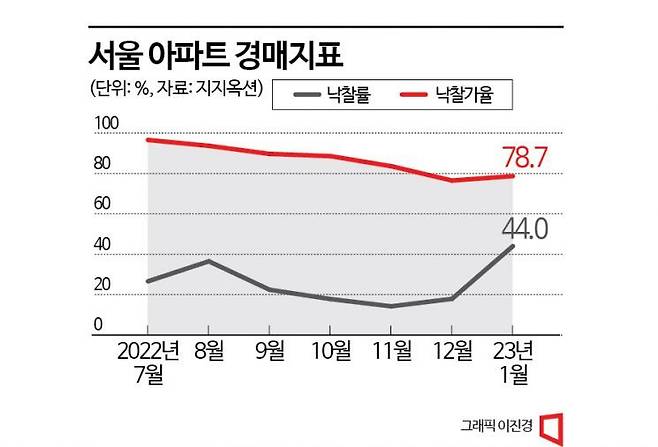 다만 북적이는 경매 시장 분위기가 부동산 시장의 회복을 의미하지는 않는다. 실제로 낙찰률은 급격히 올랐지만 낙찰가율 즉 감정가 대비 낙찰된 금액의 비율은 그리 오르지 않았다. 전국 아파트 낙찰가율은 지난해 12월 75.0%에서 올해 1월 75.8%로 소폭 회복했고, 서울 낙찰가율도 76.5%에서 78.7%로 2.2%포인트 올랐을 뿐이다.