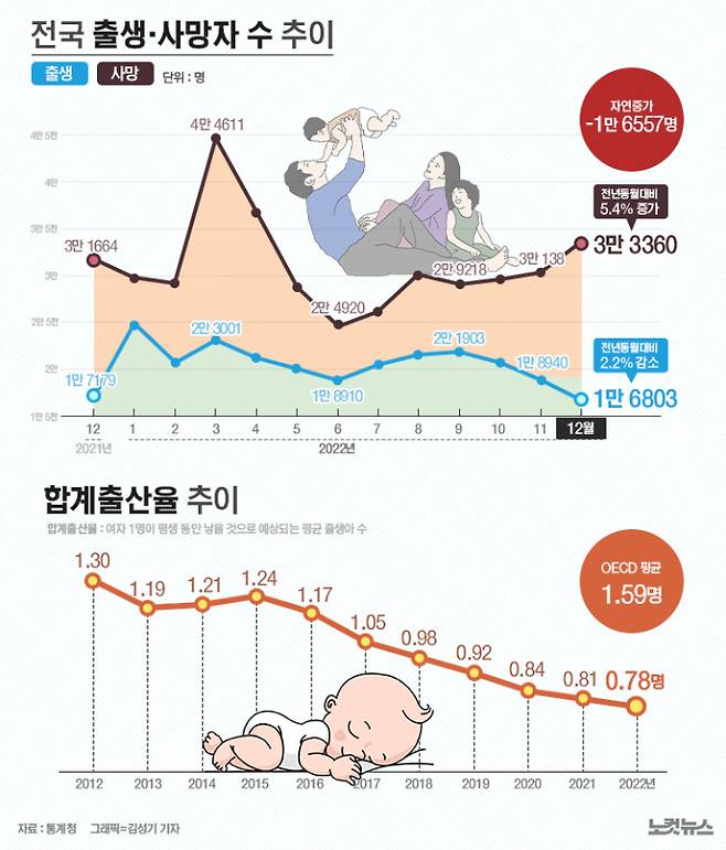통계청이 발표한 2022년 출생.사망 통계(잠정)를 보면 합계 출산율이 0.78명으로 0.8명 대가 또 무너졌다. 인구를 유지하기 위해 필요한 합계 출산율이 2.1명인데 해가 갈수록 출산율은 바닥을 모르고 떨어지고 있다. 예고된 결과여서 '충격'이란 말도 민망하지만 이러다 간 정상적으로 '국가를 유지할 수 있겠나'라는 걱정은 현실이 되었다.