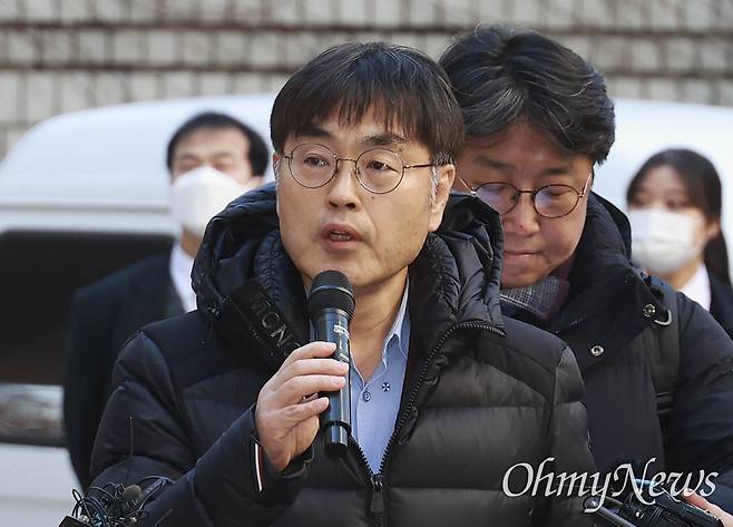 | ▲ 일명 ‘청담동 술자리’ 의혹을 제기하고, 한동훈 법무부장관 자택 침입 혐의를 받는 ‘시민언론 더탐사’ 강진구 대표가 22일 오전 서울중앙지법에서 영장실질심사를 받기전 자신의 입장을 밝히고 있다. 강진구 대표는 ‘취재기자가 고위공직자를 감시비판하는 취재활동을 했다는 이유로 한번도 아니고 두번씩이나 구속영장이 청구된 사태가 있는지 되묻고 싶습니다’고 말했다. |