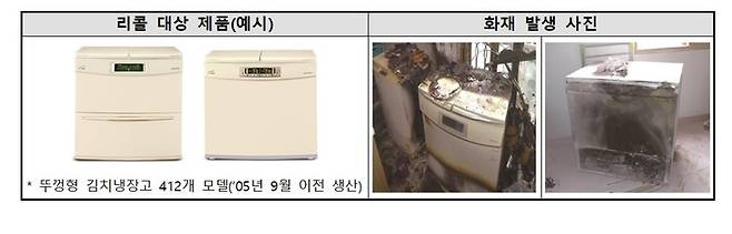 23일 국가기술표준원에 따르면 리콜 대상은 위니아가 지난 2005년 9월 이전에 생산한 뚜껑형 구조의 김치 냉장고다. 일부 오래된 부품이 합선되면서 화재가 발생할 우려가 있어, 제조사가 지난 2020년 12월2일부터 자발적 리콜을 진행 중이다.