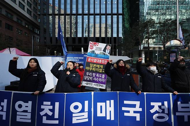 | ▲ 22일 일본이 정한 '다케시마의 날'을 규탄하는 시민단체 회원들이 종로구 주한일본대사관 옛터 앞에서 시위를 벌이고 있다. 2023.2.22 |