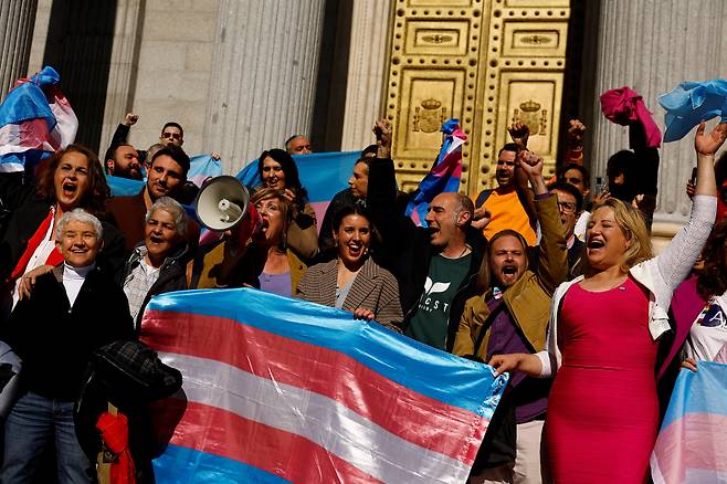 | ▲ 지난 16일(현지시간) 이레네 몬테로 스페인 평등부 장관(가운데)이 스페인 마드리드의 의회 밖에서 성소수자 활동가들과 함께 트랜스젠더법 통과를 축하하고 있다. |
