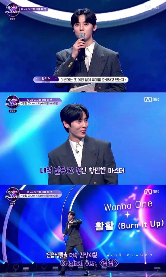 이날 스타마스터로 출연한 황민현은 "이 무대를 소개하려고 하니까 함께했던 멤버들이 보고 싶어진다. 프로젝트 그룹의 새 역사를 쓴 그룹"이라며 워너원 '활활' 팀의 무대를 소개했다.