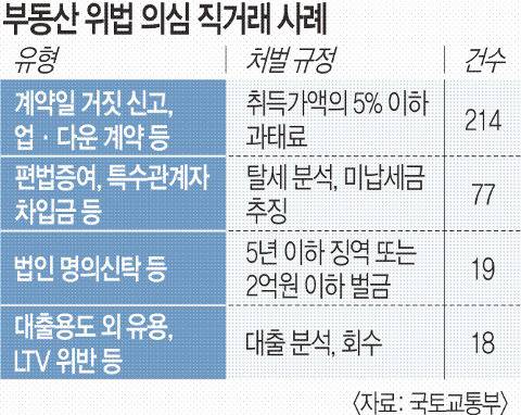 이상거래 중 가장 위반이 많은 건은 ‘거래신고 위반’이었다. 계약일을 거짓으로 신고하거나, 업·다운 계약을 한 경우로 이런 혐의가 확인되면 취득가액의 5% 이하 과태료를 내야 한다. A씨 사례처럼 편법으로 증여한 경우도 77건 적발됐다. 이 사례들 역시 국세청에 통보돼 미납 세금이 확인되면 추징 절차를 밟게 된다. 명의신탁 등 경찰청에 통보된 사례도 19건이었다.