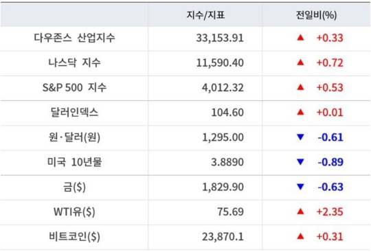 뉴욕증시는 23일(현지시간) 상승했다. 뉴욕증권거래소(NYSE)에서 다우지수는 전 거래일 대비 108.82포인트(0.33%) 상승한 3만3153.91에 마감했다. S&P500지수는 21.27포인트(0.53%) 상승한 4012.32에, 기술주 중심의 나스닥지수는 83.33포인트(0.72%) 오른 1만1590.40에 거래를 마쳤다.