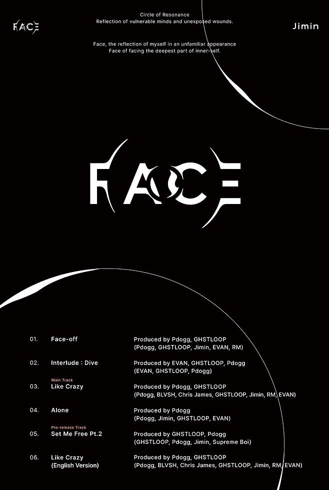 'FACE'에는 선공개 곡 'Set Me Free Pt.2'와 타이틀곡 'Like Crazy'(원 버전 및 영어 버전)를 비롯해 'Face-off', 'Interlude : Dive', 'Alone' 등이 수록된다. 지민은 이번 솔로 앨범의 곡 작업에 참여해 자신만의 음악 세계를 드러낼 예정이다.