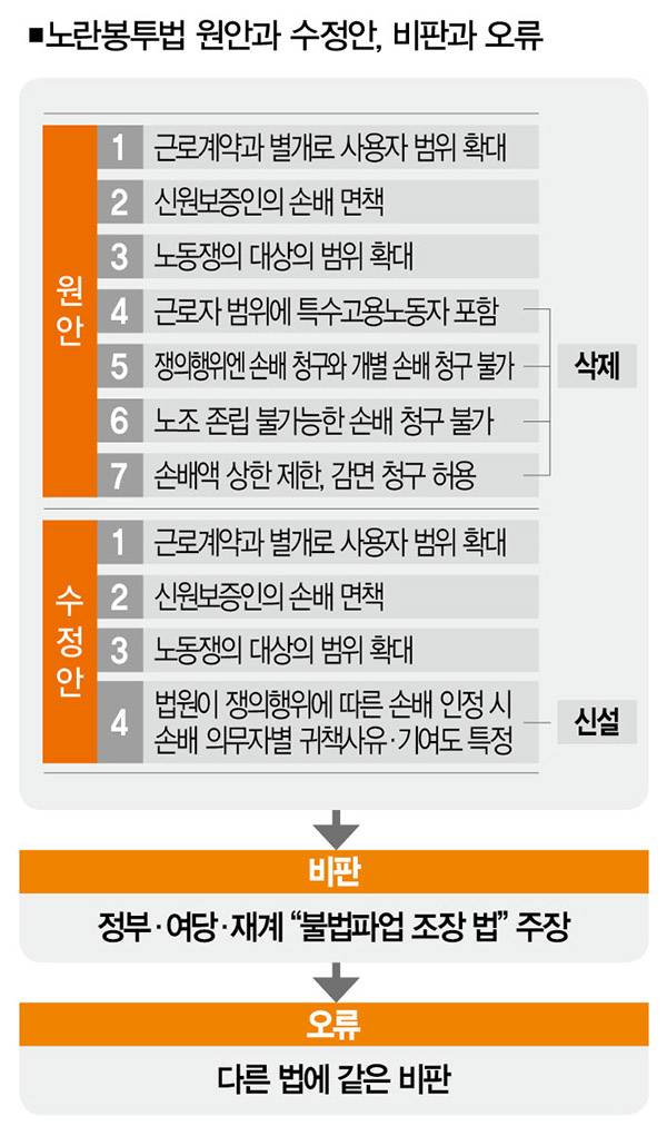 # 그런데 이는 오류다. 원안이 한차례 수정되면서 '불법파업 조장'이라는 비판을 받을 만한 내용들이 모두 빠져서다. 일부에서 노란봉투법이 노란봉투법이 아니란 말까지 나오는 이유다.