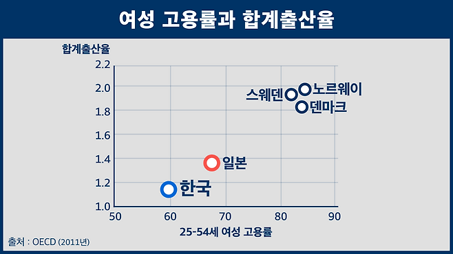 우리보다 앞서 저출생의 늪에 빠졌다가 사실상 온전히 회복한 노르웨이, 스웨덴, 프랑스의 공통점은 높은 여성고용률이다. 여성고용률과 합계출산율은 위 그래픽에서 보듯 현대사회에서 거의 언제나 함께 간다. 여성고용이 당연하게, 큰 무리 없이 굴러갈 수 있는 환경이 돼야 아이도 낳는다.